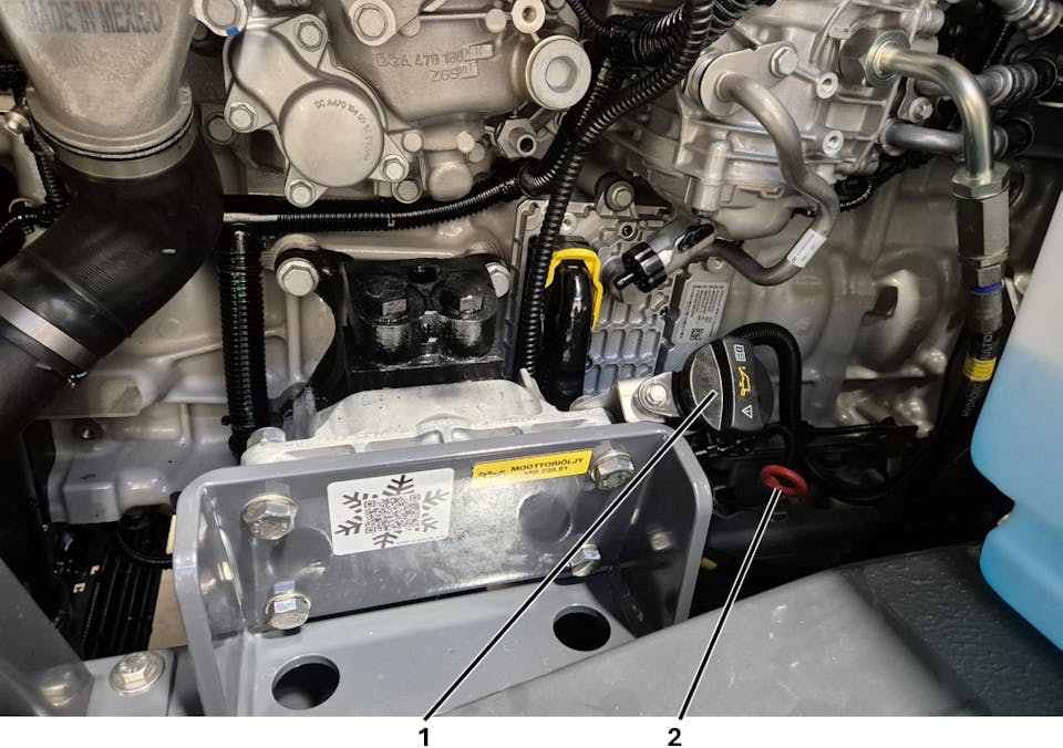 If the oil level is at or below the lower marking, top up to the upper marking with engine oil as per the lubrication chart through the oil filler cap (2).